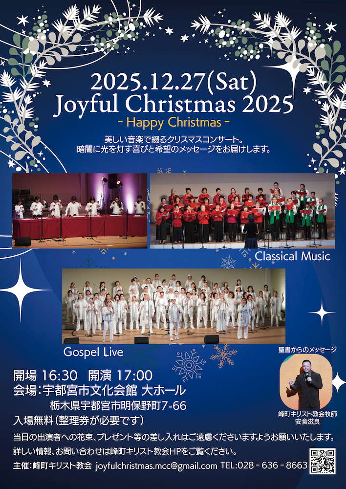 峰町キリスト教会の主催するクリスマスコンサート、ジョイフルクリスマスを本年も開催することをお知らせいたします。今年も皆様と一緒にクリスマスの喜びを分かち合えることを楽しみにしています。